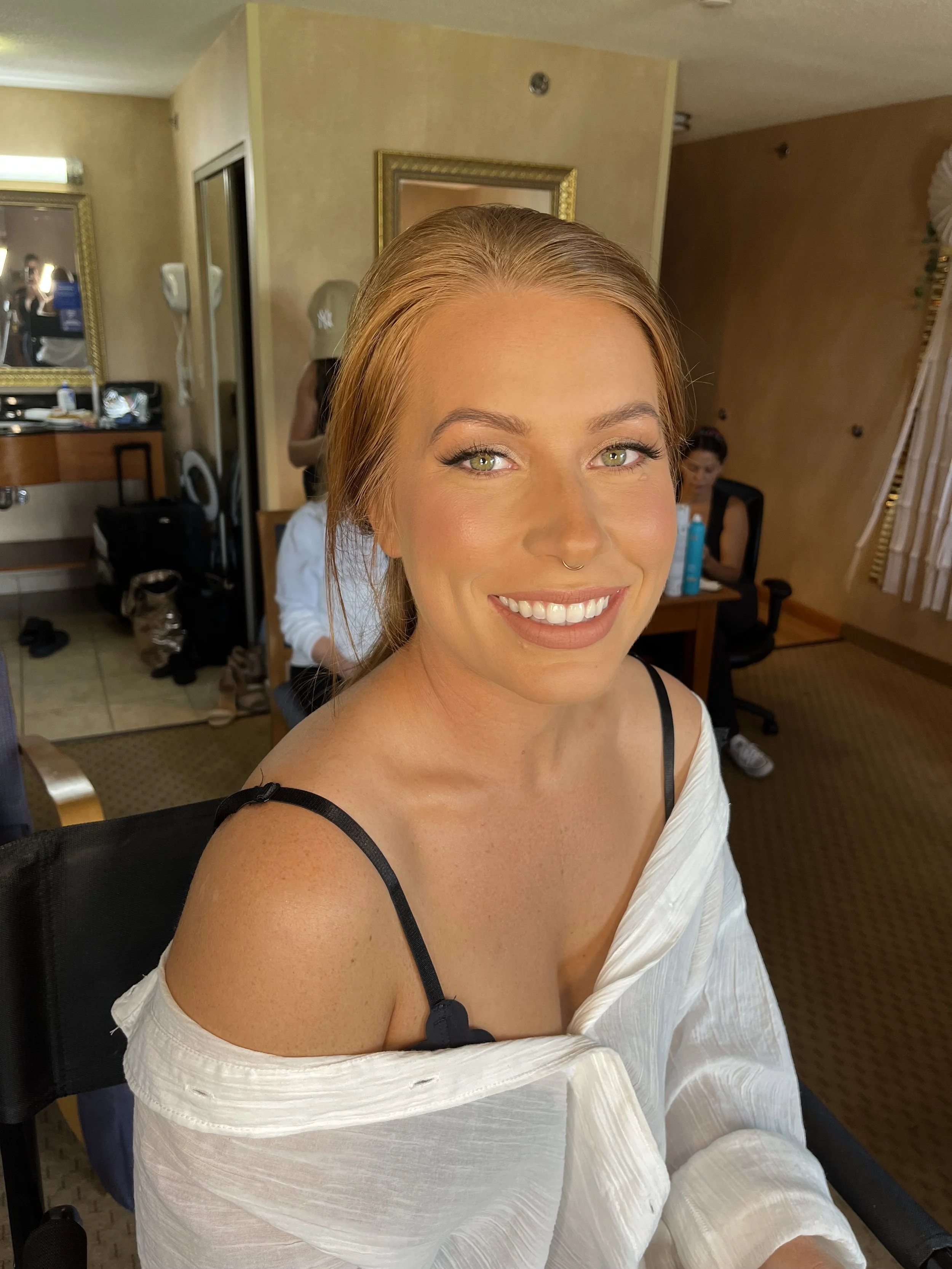 (1.5 - 2 hours) On-Location- A customized makeup look just for you. Includes a wide variety of false lashes, long-wear/water resistant products, premium skincare, décolletage makeup & the option to incorporate airbrush foundation for an all-day finish. Touch up kit included- complementary lip product, blotting papers, beauty blender, powder puff sample, lash glue, etc. Wedding Day Schedule provided – A timeline guide to keep everyone on track and ready for photos. A simple two-invoice online payment system. A 50% retainer secures your date, and the final balance is due before the big day—so when the morning arrives, all you have to do is relax, sip your coffee (or champagne!), and enjoy the glam experience without a single worry